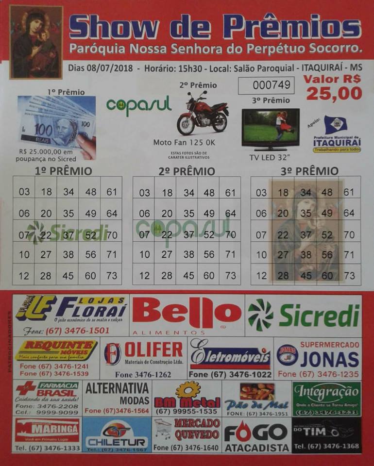 Adquira já sua cartela para o show de prêmios da festa social da padroeira.